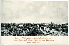 To the west, an attempt by the 48th Infantry Regiment's fusilier battalion to flank the French positions on the plateau was outflanked in turn by the French, who used their superior numbers to good effect.[25] The battalion was slaughtered and routed by the French.[26] Major Count Schlippenbach's 1st Battalion of the 10th Infantry Brigade's 52nd Infantry Regiment advanced in open company columns to plug the gap and save the now-exposed German artillery.[27] They made initial headway and pushed back the French but eventually fell victim to overwhelming French infantry firepower with all the battalion's officers killed or wounded.[27] They did succeed in buying time for more German reinforcements to arrive.[27] General von Döring was killed at this point, while moving to his left wing.[27] As the French advanced to destroy the crumbling left wing of the 5th Infantry Division, the 2nd Battalion and fusilier battalion of the 52nd Infantry Regiment under Colonel von Wulffen moved up the plateau and used their fire and bayonets to chase the French back to Flavigny.[27] German losses were heavy, with the fusilier battalion commander Major Herwarth von Bittenfeld killed and the 2nd Battalion's commander Major von Bünau wounded.[27] The fusilier battalion nearly ran out of ammunition.[27] Other artillery batteries of III Corps near Tronville provided fire support that contributed to the success of the 52nd.[28] The German artillery could now move forward on the left flank.[27] An X Corps detachment of two infantry battalions, two dragoon squadrons and one artillery battery arrived to reinforce 5th Infantry Division, raising its artillery strength to 30 guns and creating a strong position for the German batteries by 1200.[28] The heavy German artillery fire forced the French to support 2nd Army Corps with guns from the army reserve.[29]