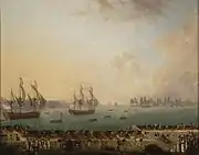 In order to cover the retreat of a convoy under Joseph de Flotte chased by the British, the lone 74-gun Annibal, under Lamotte-Picquet. For 90 minutes, Annibal single-handedly engaged the British squadron to block its advance, before she was joined by the two 64-guns, Vengeur and Réfléchi.[2] Ten to 11 of the transports were taken by the British or beached themselves to avoid capture, but the rest of the convoy of the escorting frigate Aurore managed to escape, and the division returned to its anchorage. Hyde Parker wrote Lamotte-Picquet a congratulation letter in the following days.[3]