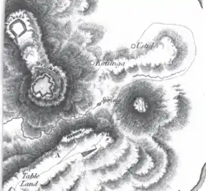 The Nalapani fort was situated on a 500–600-foot (150–180 m) hill that was covered in dense jungle. The approach to the fort was very steep in most directions and the top of the hill, which formed a tabletop feature, was about .75 miles (1.21 km) in length. Its highest point was to the south, where the town of Kalanga was located.[14] The fort was constructed in an irregular shape, having been built to conform with the shape of the ground upon which it was situated, and at the time the British entered the Dun Valley, its walls had not been finished. Upon their arrival, the British found the Nepalese defenders working to improve the fort's defences and raising the height of the walls.[14]