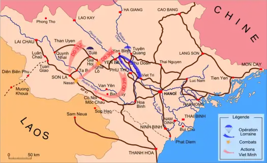 After the French loss of the border posts at Cao Bằng, Đông Khê and RC 4 in 1949 and 1950, a new commander in chief, Gen. Jean de Lattre de Tassigny, had been assigned to replace, General Carpentier.[2] De Lattre's forces were able in the following year to defeat the Việt Minh defending a series of Vietnamese offenses in 1951. The French won narrow victories at Vĩnh Yên in January, Mạo Khê in March and the Battle of the Day River in May and June (where General de Lattre lost a son in battle). De Lattre was hailed as a hero.[3]