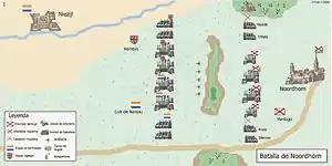 The Spanish army, led by Francisco Verdugo, with Lieutenant-Colonel Johann Baptista von Taxis as second in command, was deployed before the village of Noordhorn and behind broken ground with only one access point that was covered by a wide ravine and flanked on its left by a series of muddy ditches.[17] Aiming to create a trap for Norreys' army, the Spanish had smoothed the ground on their right in order to funnel English units and draw Norrey's troops into an engagement area where a crossfire effect could be created. Verdugo himself drove two stakes into the ground to mark the point that his cavalry was to charge upon the English vanguard.[18]