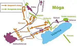 The Battle of Pákozd (or Battle of Sukoró) was a battle in the Hungarian Revolution of 1848, fought on the 29 September 1848 in the Pákozd Sukoró Pátka triangle.[1] It was one of the most important battles of the revolution, in which the Hungarian revolutionary army led by Lieutenant-General János Móga defeated the troops of the Croatian Ban Josip Jelačić.