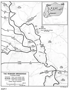 By 6 March, the 9th Armored was already just 14 kilometers (8.7 mi) from the Rhine.[2] On the same day, Botsch was so quickly transferred that he did not have time to brief his replacement, Generalmajor Richard von Bothmer. Bothmer was unable to visit Remagen, as he was concentrating on defending Bonn.[10] Instead, he dispatched a liaison officer to Remagen the evening of 6 March, but he was caught up by the American's rapid advance and was captured when he accidentally entered their lines. When retreating Germans informed Bratge on the evening of 6 March that the Americans were nearing Remagen, Bratge tried to contact Botsch, unaware that he had been reassigned.[10]