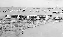 The 52nd (Lowland) Division developed a strong defensive position at Romani which had its left flank on the Mediterranean Sea, here a series of redoubts were built running southwards from Mahamdiyah along the line of high sand hills about 7 miles (11 km) to a dune known as Katib Gannit 100 feet (30 m) high. This line of sand hills, which were high enough to see Katia oasis from, marked the eastern edge of an area of very soft and shifting sand beyond which were lower dunes and harder sand where movement by both infantry and mounted forces was considerably easier. Between the shore at the western end of the Bardawil Lagoon and Katib Gannit (the principal tactical point on the eastern slopes of the Romani heights), the infantry constructed a line of 12 redoubts about 750 yards (690 m) apart, with a second series of redoubts covering the Romani railway station and the right of the defensive position which curved like a hook westward, then northward. A total of 18 redoubts were constructed, which when fully garrisoned held from 40 to 170 rifles each, with Lewis guns and an average of two Vickers machine guns allotted to each position; they were well wired on the right side of each of the positions, although there was no wire between the redoubts.[46] This defensive line was supported by artillery.[47][48]