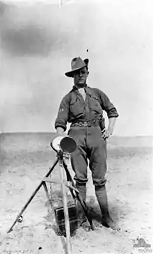 The Ottoman centre and left columns were skilfully led round the open flank of the infantry's entrenchments and on towards the camp and railway.[63] After the moon had set at around 02:30, the Germans and Ottomans made a bayonet charge on Mount Meredith. Although vastly outnumbered, the light horsemen fought an effective delaying action at close quarters, but were forced to relinquish ground slowly and to ultimately evacuate the position by 03:00. Without the benefit of moon light, the light horsemen had fired at the flashes of the enemy's rifles until they were close enough to use bayonets. The 1st Light Horse Brigade was eventually forced back; withdrawing slowly, troop covering troop with steady accurate fire, staving off a general attack with the bayonet to their fall-back position; a large east/west sand dune called Wellington Ridge at the southern edge of the Romani encampment.[63][64][65] During the retirement to Wellington Ridge, the covering squadrons on the left near Katib Gannit were also attacked, as was the squadron on the right, which was taken in the flank and suffered considerable loss, but managed to hold its ground until the position in its rear was occupied. By 03:30, all light horsemen south of Mount Meredith had been forced back to their led horses and had succeeded in disengaging and falling back to their second position. Soon after, an Ottoman machine gun was shooting down on the light horse from Mount Meredith.[62]