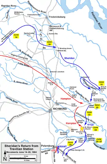 On June 20, Fitz Lee attempted to attack the Union supply depot at White House, but Sheridan's arrival relieved the garrison there. On June 21, Sheridan crossed over the Pamunkey River, broke through the Confederate cordon at St. Peter's Church, and led 900 wagons toward the James River. They crossed the Chickahominy River on June 22 and June 23, bypassing stiff opposition south of Jones's Bridge on June 23; Hampton had been unable to intercept Sheridan prior to this, so crossed the Chickahominy upstream from the Union crossing and hastened south.[8]