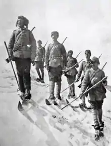 The 3rd Army, under the command of Enver, was composed of the IX, X and XI Corps. 3rd Army's headquarters and the IX Corps were located in Erzurum. The X Corps was stationed in Sivas, and the XI Corps was in Elazığ (Mamuretülaziz). A detachment unit under the command of the German Lieutenant Colonel Stange was established from the 3rd Infantry Division, originally stationed in Thrace, to reinforce the offense and pin down the Russians. This detachment unit, known as Stanke Bey, consisted of two battalions of the 8th Infantry Regiment and two artillery batteries.[14] The fighting power of 83,000 regular troops, reserves, and personnel from the Erzurum Fortress totalled 118,000.[4] The total manpower including transportation units, depot regiments, and military police was 150,000.[4] There were 73 machine guns and 218 artillery pieces.[4] Ottoman forces were inadequately prepared for the campaign. Two divisions of the IX Corps began a long trek with no winter clothing and only dry bread and olives for rations.[6]