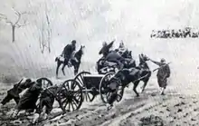 The Ottoman 3rd Army started with 118,000 fighting men. It was reduced to 42,000 effective soldiers in January 1915, with an additional 12,000 in the Erzurum fortress garrison. 25,000 Turkish troops had become casualties even before the battle started,[7] 30,000 frozen bodies were found by the Russians after the battle,[26][27][28] and the entire Third Army was reduced to no more than 12,500 men.[28][27] There are conflicting figures for Ottoman casualties, though it is clear that the Ottoman casualties were definitely huge, and the military hospitals of the Erzurum area were overflowed with wounded and sick.[29] Sources do not agree on what should be included in the final sum. The Turkish official history and medical records states 33,000 KIA, 10,000 died in hospitals, 7,000 prisoners, 10,000 seriously wounded, for some 60,000 total irrecoverable casualties. Another estimate given by the French Commandant Larcher is 90,000 dead and 40,000–50,000 captured, which is often repeated in modern recountings of the battle.[29] However, such figures are considered unreliable, both because they exceed the total strength of the entire Third Army and because the actual Chief of Staff of the Third Army (also a German), Lieutenant Colonel Guse, gave casualties as 37,000 dead and 7,000 missing based on operational returns.[30] Artillery losses were 12 field artillery pieces and 50 mountain artillery.
