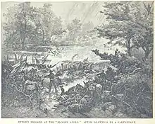 Grant sent in reinforcements at about 6:30 a.m., ordering both Wright and Warren to move forward. The VI Corps division of Brig. Gen. Thomas H. Neill headed for the western leg of the Mule Shoe, at the point where it turned to the south. This sector of the line, where the heaviest fighting of the day would occur, became known as the "Bloody Angle." As Union brigade after brigade slammed into the line, William Mahone brought two of his brigades—under Brig. Gens. Abner M. Perrin and Nathaniel H. Harris—hurrying back from the extreme left flank to come to Ramseur's aid. Perrin was killed. By 8 a.m, heavy rain began to fall and both sides fought on the earthworks slippery with both water and blood. The South Carolinians of Brig. Gen. Samuel McGowan's brigade joined the defense at the critical point. At 9:30 a.m., the VI Corps division under Brig. Gen. David A. Russell joined the attack. A section of Union artillery was able to advance close to the Confederate lines and cause numerous casualties. But Confederate artillery also had a severe effect on the advance of Russell's men.[38]