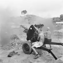 3 RAR formally relieved a British Army battalion, the 1/7th Gurkhas, in the Bau area of Sarawak on 22 March 1965, although they had mounted a number of familiarisation patrols inside Malaysian territory over the proceeding weeks.[10] Joining the West Brigade, the Australians were initially deployed in a series of company bases along the border, guarding the approaches to the capital Kuching just 31 miles (50 km) away.[11] Commanded by Lieutenant Colonel Bruce McDonald, the battalion was deployed with three of its four rifle companies forward at Stass (A Company), Bukit Knuckle (B Company) and Serikin (C Company) in order to cover the border areas, with the fourth company (D Company) remaining in reserve at Bau along with Battalion Headquarters. On average, each company operated on a frontage of around 7,700 yards (7,000 m).[12][13] In support in West Brigade was the British 4th Light Regiment, equipped with 105-millimetre (4.1 in) L5 pack howitzers and 5.5-inch (140 mm) medium guns. Included were the guns of 102nd Field Battery, Royal Australian Artillery, which had recently been deployed to West Sarawak.[14]