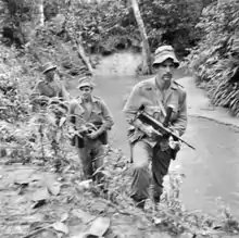 Hodgkinson worked his way around to the left towards the Indonesian line of approach, subsequently engaging and killing two more, and wounding a third. Guest gathered the right hand elements of 7 Platoon, hooking around Hodgkinson and counter-attacking the remaining Indonesians, killing the previously wounded soldier and one other. Yet another wounded Indonesian was observed to crawl away while the tenth proceeded to run off unharmed back in the direction from which the patrol had come. Within twenty minutes the contact was over and the Australians proceeded to collect the discarded Indonesian weapons and equipment, including a Browning Automatic Rifle, three MI rifles and 200 rounds of ammunition.[24] Dressed in US steel helmets, green shirts and blue and khaki shorts, the Indonesian soldiers were subsequently identified as members of 440 Battalion.[25][26]