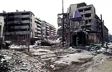 The Vrbanja Bridge was located in no-man's-land between the besieged Army of the Republic of Bosnia and Herzegovina (Armija Republike Bosne i Hercegovine, ARBiH) and the surrounding Army of Republika Srpska (Vojska Republike Srpske, VRS) during the 1992–1996 Siege of Sarajevo in Bosnia and Herzegovina. It was surrounded by tall buildings, which made it a target of sniper-fire from the beginning of the Bosnian War.[1][2] On 5 April 1992, protestors were shot on the bridge by armed Bosnian Serb nationalist police. Two women, Suada Dilberović and Olga Sučić, died as a result, and are considered by many to be the first victims of the war.[3]