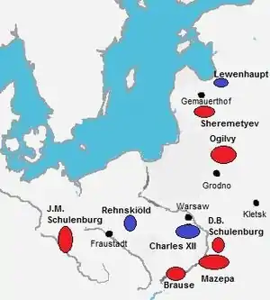 The main Swedish army at Rawicz,[Note 13] under Charles XII, struck camp at 8 August and marched towards Krotoszyn, where the captured Otto Arnold von Paykull was taken under strict military surveillance, for an audience with the king.[49] Some letters and documents Paykull had carried with him during the battle, which he had tried to discard before his imminent capture, had been brought with him to Krotoszyn.[40] The documents informed Charles XII of the greater allied plan, under which the Tsar, Peter I of Russia, intended to march into Warsaw on 30 August at the head of 40,000 men and put an end to the parliament.[50] This would, they thought, provoke Charles XII to take action and march with the Swedish army to Warsaw, where he would find himself surrounded by Johann Matthias von der Schulenburg[51] and his 20,000 men, who were assembling in Saxony,[52] to move into Poland and attack the Swedes in the rear. Charles XII, who had long sought a decisive battle with the coalition forces, indicated no sign of panic at this, but simply stated to his ministers: "I wish the enemy may keep their word". On 10 August, he once again struck camp and commenced a rapid march with his army towards Błonie, close to Warsaw, arriving on 17 August.[51] He had left General Carl Gustaf Rehnskiöld with 10,000 men near Poznań to guard against the main Saxon army under Schulenburg which threatened to enter Poland.[53]