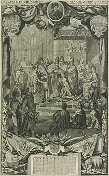 Stanisław Leszczyński's coronation, as Stanisław I of Poland, was completed on 4 October, with no further interference from Augustus II's allies.[56] After some smaller skirmishes outside, or near, Warsaw, among them an attempt made to destroy the recently Swedish-constructed bridge connecting Warsaw and Praga,[57] peace between Sweden and Poland was finally established on 28 November.[58] These developments allowed Charles XII to break camp on 9 January 1706 with his 20,000 men, and march towards the Russians at Grodno, where he partly encircled the city and starved them out.[59] Meanwhile, the Saxon army under Schulenburg was defeated by Rehnskiöld at the Battle of Fraustadt. This would result in a Swedish invasion of Saxony and the Treaty of Altranstädt (1706), by which Augustus II renounced all his claims to the Polish throne.[60]