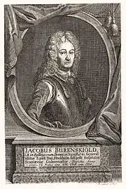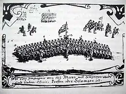The Swedish force under the command of Nieroth consisted of between 1,800[25] and 2,000 men in three regiments, divided into 24 squadrons (eight squadrons in each regiment) with one company of infantry.[26] The Swedish regiments were positioned, from left to right: 800 men from the Östergötland Cavalry Regiment; 400 men from the Upplands tremännings Cavalry Regiment (also known as Kruse's Cavalry Regiment); and 740 men from the Småland Cavalry Regiment[24] under the commands of Jacob Burensköld, Carl Nieroth and Carl Gustaf Kruse, respectively.[27] A company of 60[Note 8] infantry from the Skaraborg Infantry Regiment under captain Sven Kafle had also arrived the day before[28] and took position on the far right.[16]