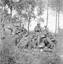 Preparing for the assault, Lieutenant Colonel Green informed brigade headquarters of his plans and was advised that 3/187 ABN was believed to be about 1,500 metres (1,600 yd) further north; however, as the exact location of the Americans was unclear, the indirect fire available to support the attack would be limited.[36] The US tanks were also initially under orders not to fire for fear of hitting their own men.[26] With mortars and artillery unavailable, the Australians proceeded to attack regardless, with the tanks carrying C Company turning east towards the KPA positions in the apple orchard.[36] At 09:30, Captain Denness dismounted 7 and 8 Platoons and aggressively counterattacked off the line of march into the apple orchard, while 9 Platoon, commanded by Lieutenant David Butler, was left near the road to protect the Australian flank.[10] Supported by the Sherman tanks' cannons and coaxial machine guns, the Australians charged the KPA positions with bayonets, Bren guns, Owen guns, Lee–Enfields, and hand grenades.[31][36] In the face of this determined attack, many of the KPA left their pits in an attempt to move to safety, only to suffer heavy casualties after exposing themselves to the fire of the two assaulting platoons, the flanking platoon and the US tanks in support.[37] The speed and ferocity of the attack surprised the defenders, and the Australians quickly overran the KPA outposts despite the lack of indirect fire.[30] The KPA, many of whom were recently trained conscripts, were then forced to withdraw for the loss of only four Australians wounded.[31][38] For his leadership in coordinating the assault, Denness was later awarded the Military Cross, while Private Charles McMurray received the Military Medal for bravery.[37][39]
