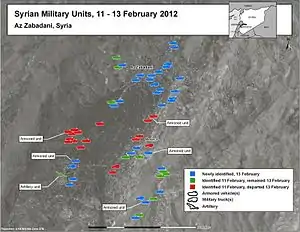 On 4 February, it was reported by activists that the Syrian army was shelling the area with mortars and firing on FSA troops with heavy machine guns, and had started to storm Zabadani's outskirts.[15][16] The Local Coordination Committees of Syria said that 300 armored vehicles, including 100 tanks were involved in the offensive. This report could not be verified independently.[8] The SOHR, another activist source based in London, said to the AFP that hundreds of armored vehicles assaulted the city of Zabadani on 6 February.[17] According to activist videos Zabadani was still under shelling on 7 February.[18]