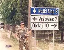 According to Croatian sources, the HV lost seven or eight troops killed in the battle.[35][38] Serb sources cite 40 killed RSK troops,[39] in the battle or its immediate aftermath, while the HV took seventeen prisoners.[40] The prisoners were taken to the Kuline barracks in Šibenik. On 23 June, a total of 29 RSK soldiers killed at the Miljevci Plateau on the first day of the battle were thrown into the Bačića Pit, contrary to orders given by Brigadier Ivan Bačić, commanding officer of the 113th Infantry Brigade. Bačić ordered burial of the killed RSK troops at a local Serbian Orthodox cemetery.[41] The bodies of the dead soldiers were later exhumed from a karst pit through the mediation of UN peacekeepers.[42] The same day, one prisoner, Miroslav Subotić, was shot in Nos Kalik by HV personnel.[41] He was one of a group of prisoners tasked with clearance of the area after the fighting.[43] According to Croatian sources, the HV also destroyed ten tanks and armoured personnel carriers, and captured six howitzers and a considerable stockpile of other weapons and ammunition in the battle.[37] The offensive brought seven villages and 108 square kilometres (42 square miles) to HV control.[38]