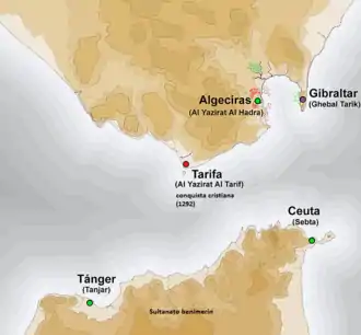 Battle of the Strait (Spanish: Batalla del Estrecho) was a military conflict contesting the ports in the Straits of Gibraltar taking place in the late thirteenth century and the first half of the fourteenth. The conflict involves principally the Spanish Muslim Emirate of Granada, the Spanish Christian Crown of Castile and the North African Muslim Marinid state. The ports' strategic value came from their position linking Spain and North Africa, thus connecting Muslims in Spain with the rest of the Islamic world.[1][2] The campaign had mixed results. Castile gained Tarifa permanently, and managed to take Gibraltar and Algeciras but both would revert to Muslim rule. Castile also failed to gain any port in the African side of the strait.[3]