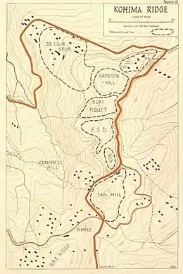 Kohima Ridge was about a mile long and about 400 yards wide, with a series of hills and gullies that ran alongside the road from Imphal to Dimapur. The steep slopes along the road made the ridge a formidable target for attackers, but it was a narrow space from which to repel an enemy attacking in strength.[2] In March 1944, the Japanese launched Operation U-Go, a large-scale invasion of India.[3] By April 6 the British, Nepalese and Indian soldiers of Kohima Garrison had been surrounded on the Kohima ridge.[4] As the siege began the Kohima Ridge was defended to the south (facing Imphal) by the 1st Assam Regiment on Jail Hill. The centre ground of the ridge was mainly defended by 4th Battalion, Queen's Own Royal West Kent Regiment. The North West of the Ridge, known as Hospital Spur, was defended by the 3rd Assam Rifles who were facing the road to Dimapur. The North East of the Ridge on a sharp corner in the road was where the Deputy Commissioner (DC) Charles Pawsey's Bungalow and Tennis Court was situated. This was initially guarded by a composite group of soldiers,[4] thought to be British and Gurkha troops from the local Reinforcement Depot.[5]