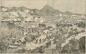 Japanese engineers determined that ten bridges 1,630 yards (1490.5m) would be required to span the river. A third of these were steel prefabricated pontoons which weighed 100 pounds each.[3] The remainder were made from local resources. In full view of Russian positions, the Japanese began constructing a causeway across the Yalu River, which was immediately targeted by two Russian batteries. With the Russians so engaged, the Japanese prepared nine other bridges that could quickly be moved into position for a rapid assault across the river at other locations.