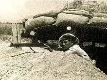 While the battle was taking place, the 65 mm artillery, four Napoleonchik canons, reached the front in the middle of the day and were placed on the Poria–Alumot ridge.[1] It was the first Israeli artillery to be used in the war.[37] At 13:20, they began to fire at the Syrians, and after about 40 rounds the latter began to retreat.[40] The Israelis also fired into Samakh, where the Syrian officers, who had until then believed that the Israelis had nothing that could hit their headquarters, took shelter. One projectile hit the Syrian ammunition depot in the village, and others ignited fires in the dry fields.[38] While the soldiers who operated the cannons (still lacking sights) were not proficient in handling them, an acceptable level of accuracy was achieved after practice shots into the Sea of Galilee. In all, the artillery fire took the Syrian army by complete surprise, and the latter decided to regroup and retreat to Tel al-Qasr, also recalling the company at Sha'ar HaGolan and Masada.[1] A total of 500 shells were fired by the Israeli artillery.[39] Syrian officers may have shot some of their fleeing soldiers.[38]