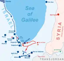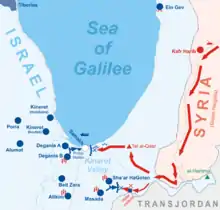 At night, a Syrian force attempted to surround the Israelis by crossing the Jordan River to the north of the Sea of Galilee, but encountered a minefield in which a senior Syrian officer was wounded.[1] This was spotted and reported by the Israelis at Tabgha,[21] and the additional reprieve allowed the Kinarot Valley villages to evacuate the children, elderly and sick, as well as conduct maneuvers which feigned massive reinforcements in the Poria-Alumot region.[1] In the panic of surprise, many men also tried to flee the frontal villages, but blockposts were set up near Afula and Yavne'el by the Military Police Service's northern command, under Yosef Pressman, who personally stopped buses and allowed only the women and children to proceed to safety.[22]