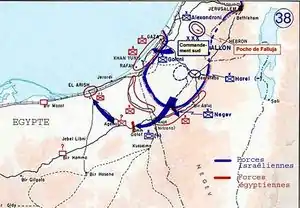 At 16:30, the force attacked Umm Katef, the position overlooking Abu Ageila.[8] The Egyptians had a strength of about one battalion.[9] They repelled the Israeli attack with anti-tank fire, while part of the attacking 9th Battalion got bogged down in the sands and failed to reach the position.[7][8] At this time, the IDF Chief of Operations Yigael Yadin sent out an order to Yigal Allon not to capture Abu Ageila until the latter came to see him.[9]