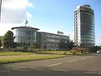 The company was founded in Zeulenroda in 1929 by Bruno Bauerfeind as a manufacturer of medical rubber stockings. In 1949 his son, Rudolf Bauerfeind, left Zeulenroda because of the policy of nationalisation in East Germany and rebuilt the company in western Germany, first in Darmstadt-Eberstadt and then in Kempen.[1][2] Immediately after German reunification, in 1991, Hans B. Bauerfeind, grandson of the founder and chairman of the management board since 1976,[3] returned Bauerfeind GmbH, as it then was, to Zeulenroda,[2] buying a compression bandage manufacturer there and investing more than 100 million euros in a new production facility, a research centre and a new 57-metre headquarters building,[4] the tallest new building constructed in Thuringia since reunification. The family-owned company became an Aktiengesellschaft in 2002.[1]