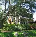 The Baughman Center consists of two buildings located along Lake Alice on the University of Florida campus. The main building is a 1,500-square-foot (140 m2) nondenominational chapel or pavilion, while the other one is an 1,000-square-foot (93 m2) administrative building. The chapel has seating for 96 people and is used for silent meditation, private contemplation, weddings, funerals and memorial services as well as a venue for small musical or performing arts events.[1] The center, named after Dr. George F. Baughman and his wife, Hazel Baughman, the benefactors of the project and is considered an oasis of calm and beauty on the bustling campus.[2] On April 18, 2012, the American Institute of Architects's Florida Chapter ranked the Baughman Center third on its list of Florida Architecture: 100 Years. 100 Places.[3]