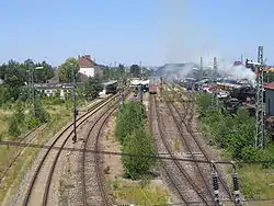 The Bavarian Railway Museum works the route to Gunzenhausen[2] and the section from Nördlingen to Feuchtwangen[3] on the line to Dombühl with historical vehicles. Its daughter company, BayernBahn Betriebsgesellschaft mbH, is responsible for the maintenance of the line to Dombühl rented from the Deutsche Bahn as well as the operation of museum vehicles on special trains, but also for other services, for example in maintenance of way trains. In addition, for several years impressive goods trains have been hauled in the Nördlingen area e.g. for wood and timber products. For this Class V 100 und V 60 diesel locomotives are usually used, but sometimes the museum's steam engines are engaged as well.