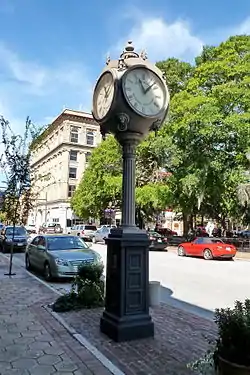 Street clocks were installed in many American cities from the 1860s to early-20th century, with the two largest manufacturers on the East Coast being the Seth Thomas Clock Company and the E. Howard Clock & Watch Company. The Baxter Clock stands in front of 323 Pollock Street, a Dutch Revival style property built in 1918 that was the longtime home of the Baxter's Jewelry Store and currently vacant since 1 January 2019. It was listed for sale or lease, and it is believed to have sold and is currently being renovated, perhaps for a restaurant.[3][4] It was manufactured by the Seth Thomas Clock Company of Thomaston, Connecticut. The clock was built in 1920, but features a style and design similar to ones made in the late-19th century. Baxter's Jewelry Store, previously located on Middle Street, moved to Pollock Street around 1920, but didn't have the clock installed until 1930.[4] It was listed on the NRHP on July 2, 1973.[1] The clock was also designated a contributing property to the New Bern Historic District, which was listed on the NRHP on June 19, 1973.[5]