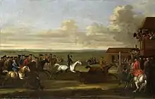 At York in 1710, Bay Bolton (then a five-year-old) beat eight six-year-olds to win Queen Anne's Gold Cup. In 1710 he also won the Subscription Purse at Middleham-Moor.[2] He then walked 200 miles to run in, and win, the Rich Prize at Quainton-Meadow in Buckinghamshire.[3] Bay Bolton was then bought by the Duke of Bolton, who sent him to Newmarket, where he won a match race against the Duke of Somerset's Wyndham and a match against Sir Matthew Pierson's Merlin. He also won two match races against Mr Frampton's Dragon.[2]