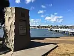 Bayview Park ferry wharf, and the namesake public park located adjacent to it, is built upon the site of the historical Burwood ferry wharf, which provided vital transport links from the region to Parramatta and the Sydney CBD in the early 19th century.[1] Burwood wharf is most significant for being the landing site of HMS Buffalo on 26 February 1840,[2] which carried 58 patriote exiles who fought against British colonialists in the Lower Canada Rebellion.[3][4] The prisoners, who were incarcerated at Longbottom Stockade, formerly located at the present site of Concord Oval, were pardoned four years later,[3][4] and policies pertaining to responsible government for which the Rebellions of 1837–1838 were fought, were eventually adopted in both Canada and Australia in the decades after the rebellions.[5][6] A memorial stone to commemorate the 130th anniversary of the landing of HMS Buffalo was originally erected at Cabarita Park in May 1970 by Concord Council, and dedicated by Prime Minister of Canada Pierre Trudeau. The memorial stone was moved to its current location adjacent to the wharf entrance following the development of the Bayview Park reserve in February 1984.[2] A similar memorial stone for the exiles of the Upper Canada Rebellion, who were also carried to Australia aboard MS Buffalo, was erected in Hobart, Tasmania.[7] The geographic features of France Bay, Exile Bay, and Canada Bay, were named in honor of the convicts and their landing at the present-day Bayview Park.[8]