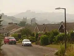 Beaminster is sited 50 to 80 metres (160–260 ft) above sea level in a bowl-shaped valley, surrounded by hills which rise to 244 metres (801 ft) at Beaminster Down to the northeast. The River Brit and many small streams emerge from springs on the slopes above the town.[10] The confluences of several of these streams are within the town's boundaries. Beaminster's growth has historically been along the course of these streams, resulting in a settlement pattern that is roughly star-shaped.[11]