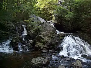 The Middle Branch of the Swift River passes through the steep granite cliffs of Bear's Den reservation on its way to the Quabbin Reservoir.[5] The gorge is 75' deep and rimmed with hemlock.[4][6] At one point, a change in elevation creates a waterfall. According to one description: