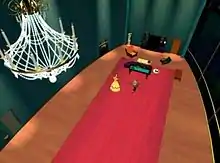 First rendered as a simple cube,[25] the filmmakers used computers to design the ballroom as a production set, making it the first full-dimensional computer-generated colored background in history.[25] Unlike Disney's previous CGI ventures, Beauty and the Beast's ballroom was a much more detailed task that required animators to work exclusively with computers to compose, animate and color the scene.[49][50] According to Hillin, the revolutionary use of computers allowed for a combination of theatrical lighting and "sweeping" perspectives, which ultimately introduced live-action techniques to animation.[36] To make the scene a "special moment" for the characters,[51] a "virtual camera" was used to allow the animators to create the illusion of tracking, panning and zooming[50] that "establish[es] the mood" while helping audiences experience what the characters themselves are experiencing.[36] Imitating tracking shots, the camera frequently soars and zooms around the couple.[52] The camera first follows Belle and the Beast as they enter the ballroom before panning until it finally returns to focus on the two characters.[53] In his book Basics Animation 02: Digital Animation, author Andrew Chong wrote that "The sweeping camera move with a constantly shifting perspective during the ballroom sequence was a composition of traditionally drawn elements for the characters with digitally animated scenery".[54] Several computer animators, layout artists, art directors and background artists used their combined efforts to achieve the scene's end results; the ballroom's official dimensions read 72 feet high, 184 feet long and 126 feet wide.[55] The space also houses 28 windows and a dome that measures 86 by 61 feet; the dome's mural was first hand-painted before it was texture-mapped onto it using a computer.[55] Each element was carefully constructed individually.[55] Timothy Wegner described the finished product in his book Image Lab as a "huge and elegant" ballroom in which "the walls are decorated with elaborate moldings, Corinthian columns, and hundreds of candles".[56]