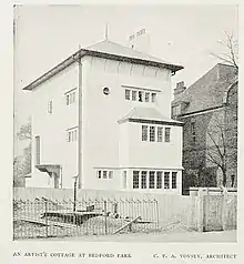 Bedford Park has been described as the world's first garden suburb.[1] Although it was not built in the co-operative manner like some later developments (Brentham Garden Suburb, Hampstead Garden Suburb), it created a model that was emulated not just by the Garden city movement, but by suburban developments around the world. Sir John Betjeman described Bedford Park "the most significant suburb built in the last century, probably in the western world".[2] Herman Muthesius, the celebrated German critic who wrote The English House in 1904 said, "It signifies neither more nor less than the starting point of the smaller modern house, which spread from there over the whole country."