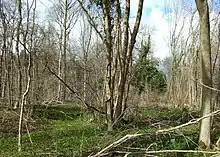 The planting programme of the 1940s was principally of oak, but also larch, Scots pine and Corsican pine.[13] Unlike in a coppice-with-standards rotation, Bedford Purlieus woodland is much more even in age. However, when an ancient woodland is cleared and planted the result is not just a monoculture of the newly planted trees. The canopy is now a mix of the planted trees, self-sown trees and shrubs, and regrowth of coppice stools, some probably of more recent origin, other stools clearly dating back to antiquity.[14] The species diversity that characterises the woods was thus retained, and oak, lime, large-leaved elm, hazel, ash, field maple, English elm, sycamore, chestnut and birch are all to be found in substantial quantities.[15]