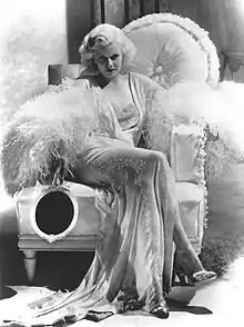 The artwork for Bedtime Stories was shot by French fashion photographer Patrick Demarchelier, at the Eden Roc Miami Beach Hotel in the United States in August 1994.[32] She also worked with hairstylist Sam McKnight for the pictures, which were directed by Fabien Baron.[33] McKnight recalled that it was a "low-key" photoshoot featuring less than 50 people, and was conducted on Madonna's birthday, hence it was wrapped up fast since the singer had to go for her party.[34] The cover was released online, and depicted the singer upside down, looking upward with heavy make-up, a nose ring, blond hair, and simple pastel colored fonts.[35] Inspired by actress Jean Harlow, the singer sported over-plucked eyebrows for the photos which were designed by makeup artist Francois Nars.[36]