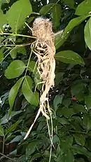 Using bits of cobwebs, bark, and lichen, the female builds a cup-shaped nest that is about 2.5 cm (0.98 in) in diameter. Nests have been built on single clothespins. She lines the nest with soft plant fibers and there she will lay her eggs. She alone incubates the eggs and raises the young.