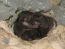 Estrus and copulation occur at the same time as in the pine marten.[21] Copulation can last longer than 1 hour.[22] Mating occurs in the June–July period, and takes place in the morning or in moonlit nights on the ground or on the roofs of houses. The gestation period lasts as long as the pine marten's, lasting 236–237 days in the wild, and 254–275 days in fur farms. Parturition takes place in late March-early April, with the average litter consisting of 3-7 kits. The kits are born blind, and begin to see at the age of 30–36 days. The lactation period lasts 40–45 days. In early July, the young are indistinguishable from the adults.[21]