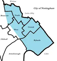 Beeston divides into four wards for local electoral purposes within the borough of Broxtowe: Beeston North, Beeston Central, Beeston Rylands and Beeston West.[6]
