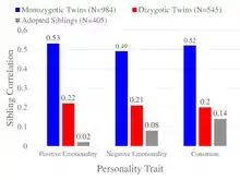 The nature of this environmental influence, however, is such that it tends to make individuals in the same family more different from one another, not more similar to one another.[3] That is, estimates of shared environmental effects () in human studies are small, negligible, or zero for the vast majority of behavioural traits and psychiatric disorders, whereas estimates of non-shared environmental effects () are moderate to large.[11] From twin studies is typically estimated at 0 because the correlation () between monozygotic twins is at least twice the correlation () for dizygotic twins. When using the Falconer variance decomposition () this difference between monozygotic and dizygotic twin similarity results in an estimated . It is important to note that the Falconer decomposition is simplistic.[24] It removes the possible influence of dominance and epistatic effects which, if present, will tend to make monozygotic twins more similar than dizygotic twins and mask the influence of shared environmental effects.[24] This is a limitation of the twin design for estimating . However, the general conclusion that shared environmental effects are negligible does not rest on twin studies alone. Adoption research also fails to find large () components; that is, adoptive parents and their adopted children tend to show much less resemblance to one another than the adopted child and his or her non-rearing biological parent.[3] In studies of adoptive families with at least one biological child and one adopted child, the sibling resemblance also tends be nearly zero for most traits that have been studied.[11][55]