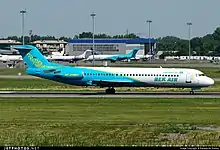 Bek Air Flight 2100 was a domestic passenger flight from Almaty to Nur-Sultan, Kazakhstan, operated by a Fokker 100 that crashed on 27 December 2019 while taking off from Almaty International Airport.[3][4] There were 98 people on board – 93 passengers and 5 crew.[1][5] Thirteen people died in the crash, and 66 were injured.[5][6] The local government started investigations the same day.[6]