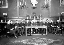 Following the 5 October 1910 Revolution, the Secretaria-Geral da Presidência da República (Secretary-General of the Presidency) moved into the palace on 24 August 1911, as article 45 of the Constitution prohibited the Chief of State from occupying a residence on properties held by the State. A loophole in the document allowed the authorization on 28 June 1912 of a government edict to rent an annex alongside the Palace for 100,000 réis per month to house the first President Manuel de Arriaga, who eventually preferred to live in his local residence and work at the palace. This policy of renting the space continued throughout the period of the First Republic.[2][4]