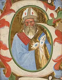 This is taken most likely from the beginning of the Mass of St. Augustine. The initial seems to belong to the phrase "In medio Ecclesiae," a segment of the Common of Doctors. The image depicts the saint with the initial I covered with blue and pink leaves. The colored palmette seems to come from Florence. The black robe that is worn belongs to the Augustinians, decorated with an imitation of a golden embroidery. St. Augustine holds a pale blue book and he wears a white miter. His skin has a brownish hue that is harsh against white facial hair. Roundels in the golden background are white and bordered with ink.[1]