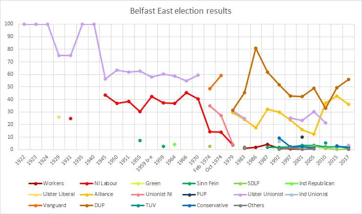 Belfast East is an overwhelmingly unionist constituency with nationalist parties routinely failing to get more than 10% of the vote combined. The main interest has been the contest between unionist parties and the fortunes of the Alliance Party of Northern Ireland.