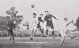 On 11 October 1900, Beerschot AC honorary president Jorge Díaz announced that Antwerp would host a series of challenge matches between Europe's best football teams.[12] After some organisational problems, on 28 April 1901, Beerschot's pitch hosted its first tournament, in which a Belgian A-squad and a Dutch B-team contested the Coupe Vanden Abeele.[13][14] Belgium won,[15] and beat the Netherlands in all three follow-up matches;[16] FIFA does not recognise these results because Belgium fielded some English players.[16] On 1 May 1904, the Belgians played their first official match, against France at the Stade du Vivier d'Oie in Uccle; their draw left the Évence Coppée Trophy unclaimed.[17] Twenty days later, the football boards of both countries were among the seven FIFA founders.[18][19] At that time, the Belgian squad was chosen by a committee drawn from the country's six or seven major clubs.[20] In 1906, the national team players received the nickname Red Devils because of their red jerseys,[21] and four years later, Scottish ex-footballer William Maxwell replaced the UBSSA committee as their manager.[22] From 1912, UBSSA governed football only and was renamed UBSFA.[lower-alpha 4][1][10] During the Great War, the national team only played unrecognised friendlies, with matches in and against France.[23][24]