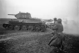 The Belgrade Offensive or the Belgrade Strategic Offensive Operation (Serbian: Београдска операција / Beogradska operacija; Russian: Белградская стратегическая наступательная операция, Belgradskaya strategicheskaya nastupatel'naya operatsiya) (15 September 1944 – 24 November 1944)[6] was a military operation during World War II in Yugoslavia in which Belgrade was liberated from the German Wehrmacht through the joint efforts of the Soviet Red Army, Yugoslav Partisans, and the Bulgarian Army.[7] Soviet forces and local militias launched separate but loosely cooperative operations that undermined German control of Belgrade and ultimately forced a retreat.[8] Martial planning was coordinated evenly among command leaders, and the operation was largely enabled through tactical cooperation between Josip Broz Tito and Joseph Stalin that began in September 1944.[9][10] These martial provisions allowed Bulgarian forces to engage in operations throughout Yugoslav territory, which furthered tactical success while increasing diplomatic friction.[11]